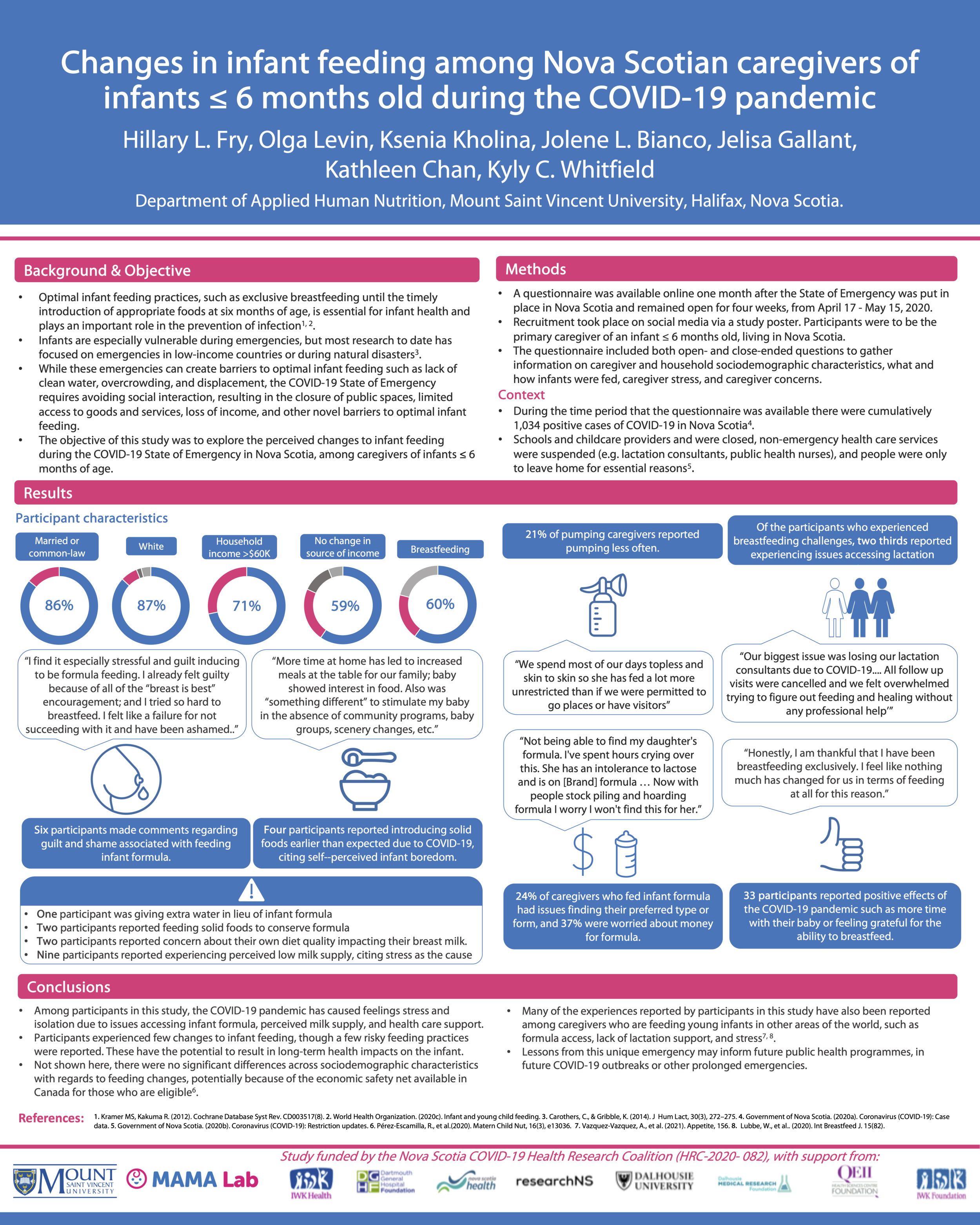 In April 2020, the MAMA Lab set out to explore what Nova Scotian caregivers of newborns were experiencing during the COVID-19 State of Emergency, and whether the pandemic was changing how or what caregivers were feeding their babies. To do this, we created an online survey which opened one month after the provincial State of Emergency was declared in Nova Scotia. Remembering back to this time, non-emergency healthcare was suspended, public indoor spaces and non-essential businesses were closed, social contact was only allowed within household ‘bubbles’, and even outdoor activities were limited. In the month afterwards, 335 new parents filled out our survey. Participants were nearly all female, white, and generally had high household incomes. Over half of participants were breastfeeding, while 21% were formula-feeding and 19% were feeding both formula and breastmilk.